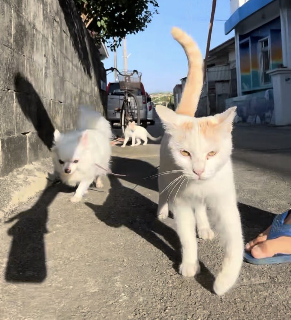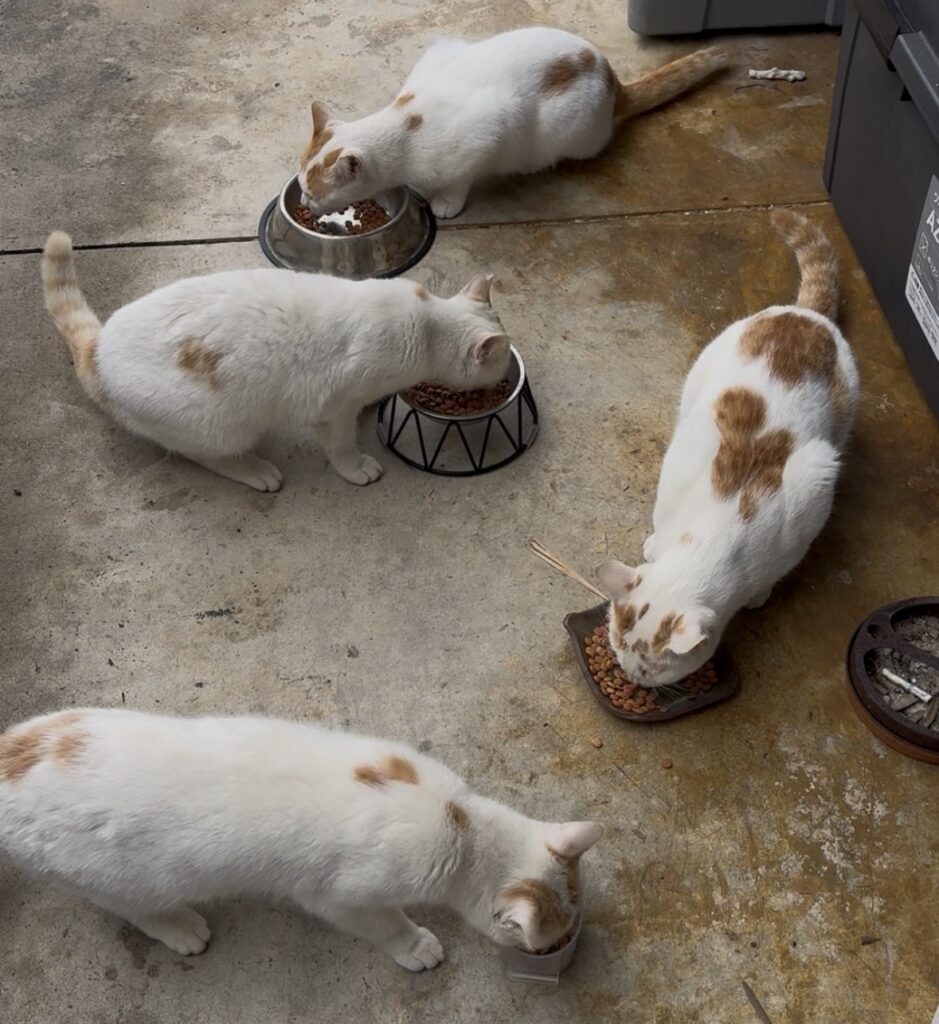 ぱぴこから生まれた三つ子ちゃん。ジャイ(オス)は背中のハートが目印で優しくて温厚。アン(メス)は桜耳でちょっとやんちゃだけど人が大好き。2匹とも歩いていると永遠についてきます。コーン(オス)は野良猫らしく警戒心MAXで触ると「しゃー」と威嚇されます。