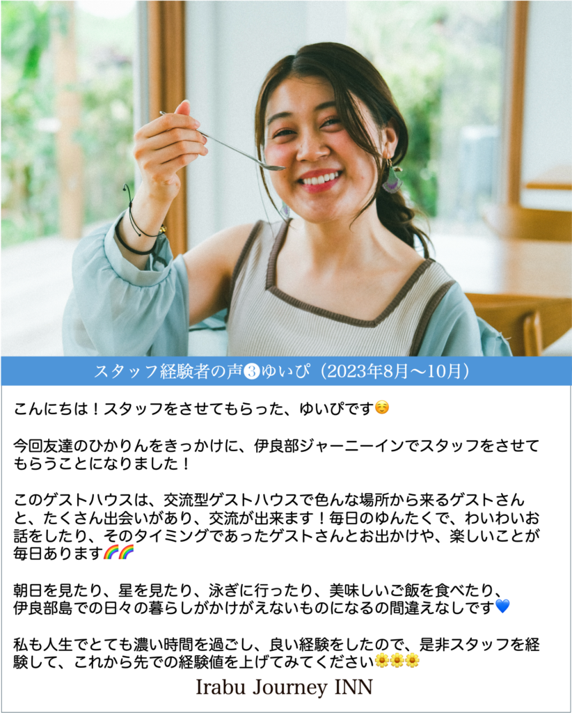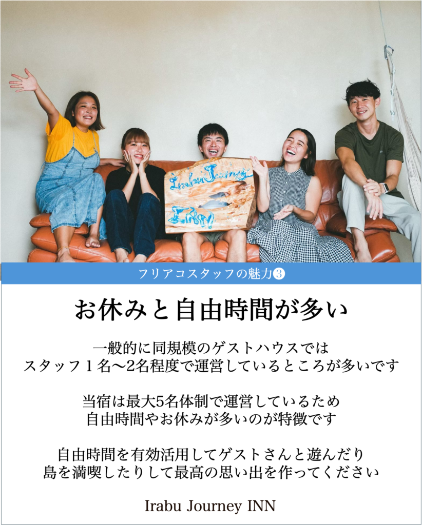 Irabu Journey INNではフリアコスタッフを募集しています。フリアコスタッフとはゲストハウスでの滞在費等を無料にする代わりにゲストハウス業務の一部をお手伝い頂くスタッフのことです。(お給料は出ません)伊良部島の美しい自然の中でゆったりとした時間を楽しみつつ、沢山の人と出会って、楽しい日々を過ごして頂けたらと思います。