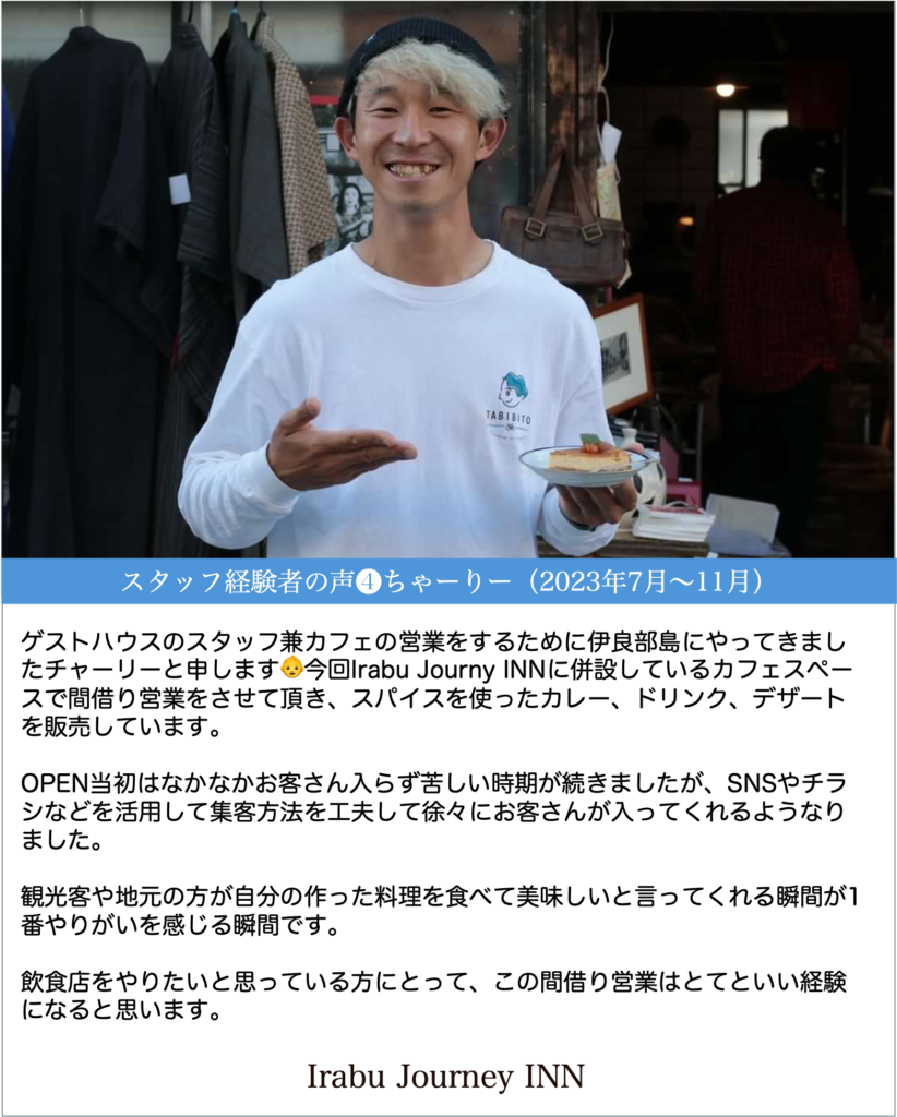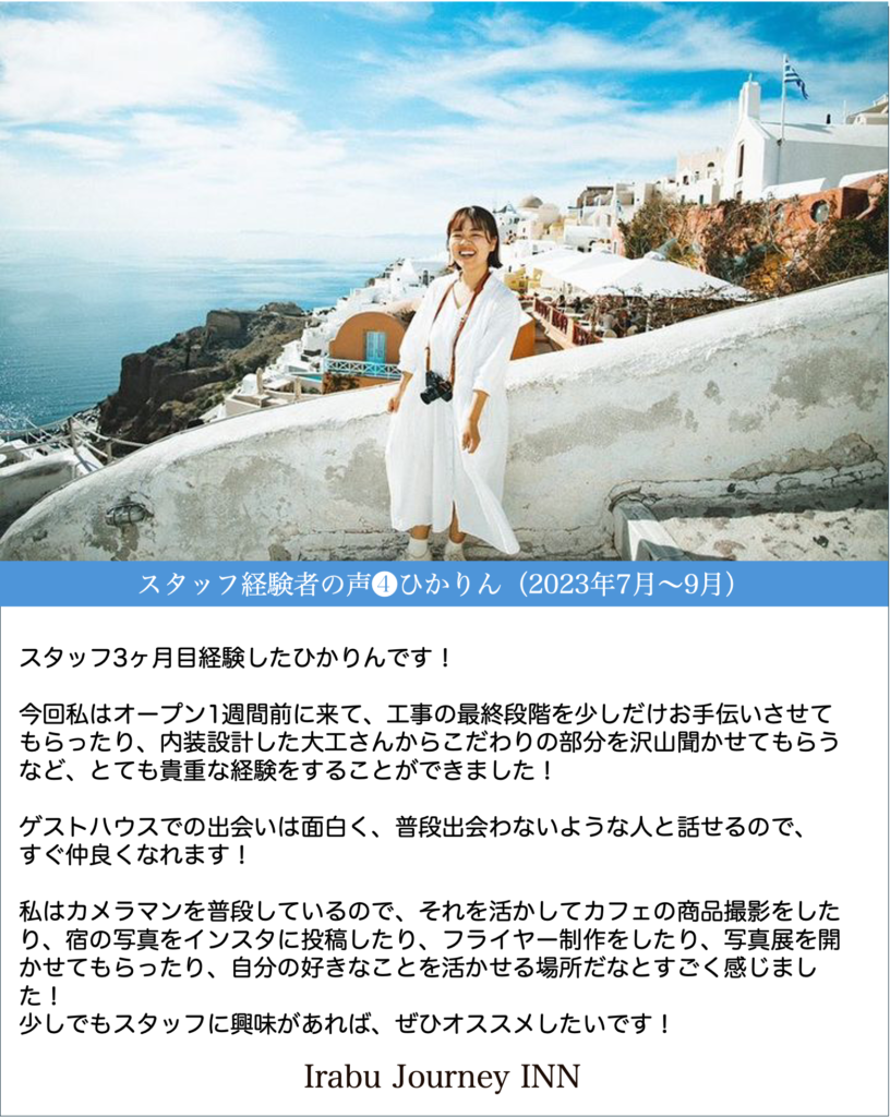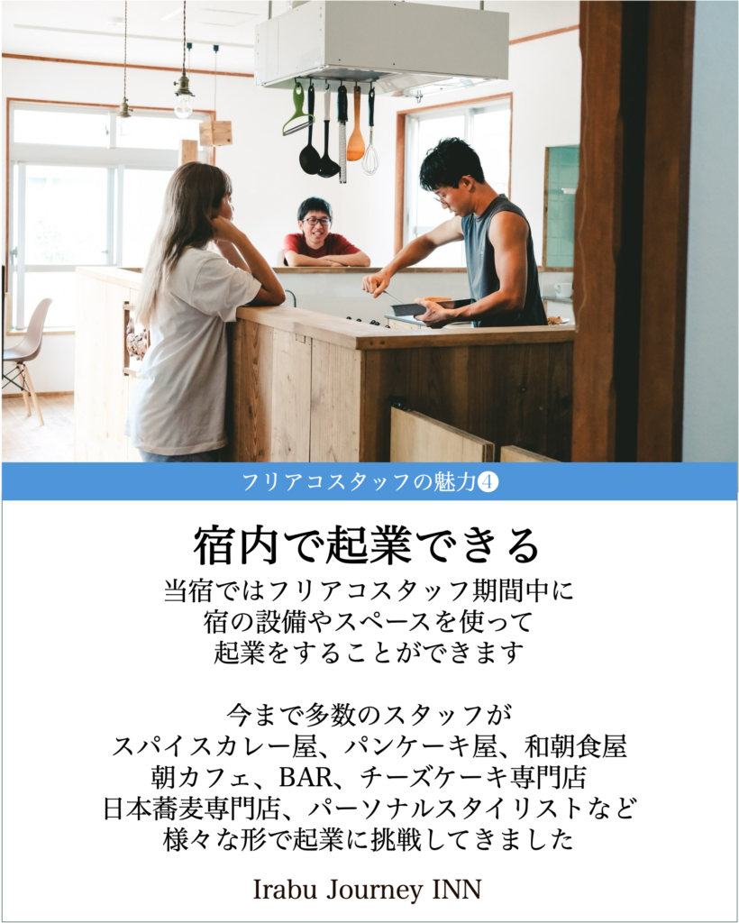 また単なるスタッフとしてだけでなく、望む人には今後のキャリアに繋がるよう趣味や特技を活かして活躍できる場を用意したいと考えています。私たちからは場所と機会を提供しますので、皆様の力を存分に発揮して、滞在時の生活費の足しや、今後のキャリアに繋がる経験をして頂けたら幸いです。