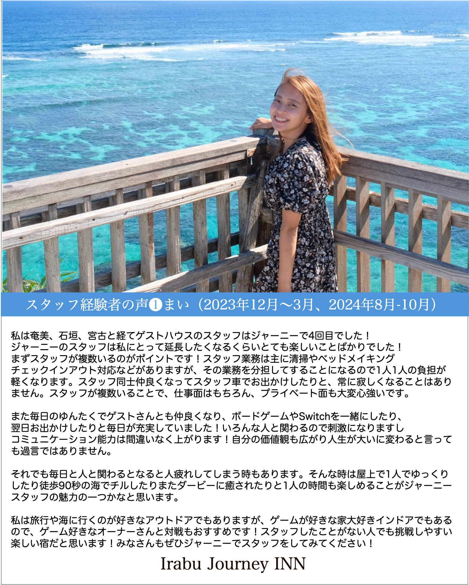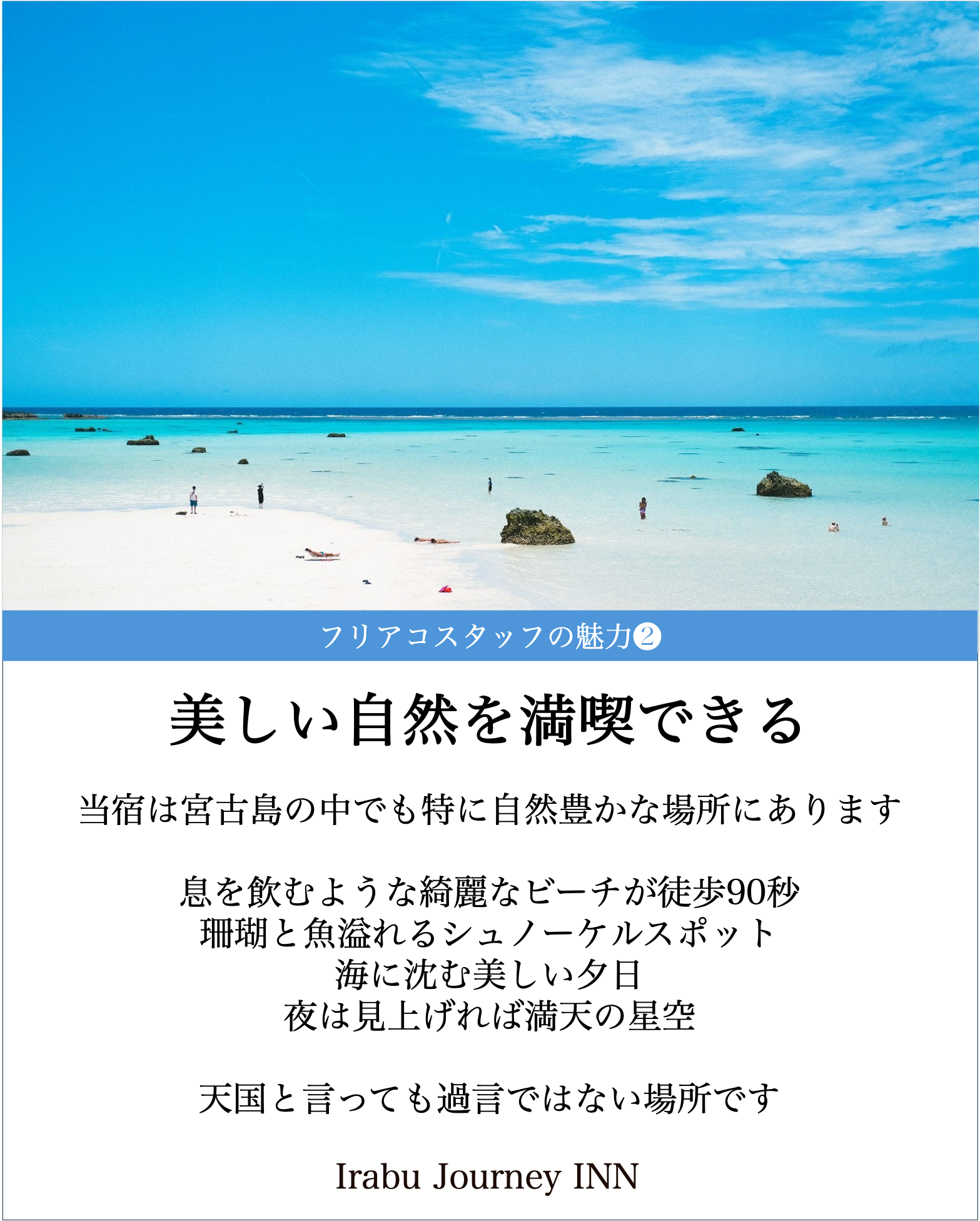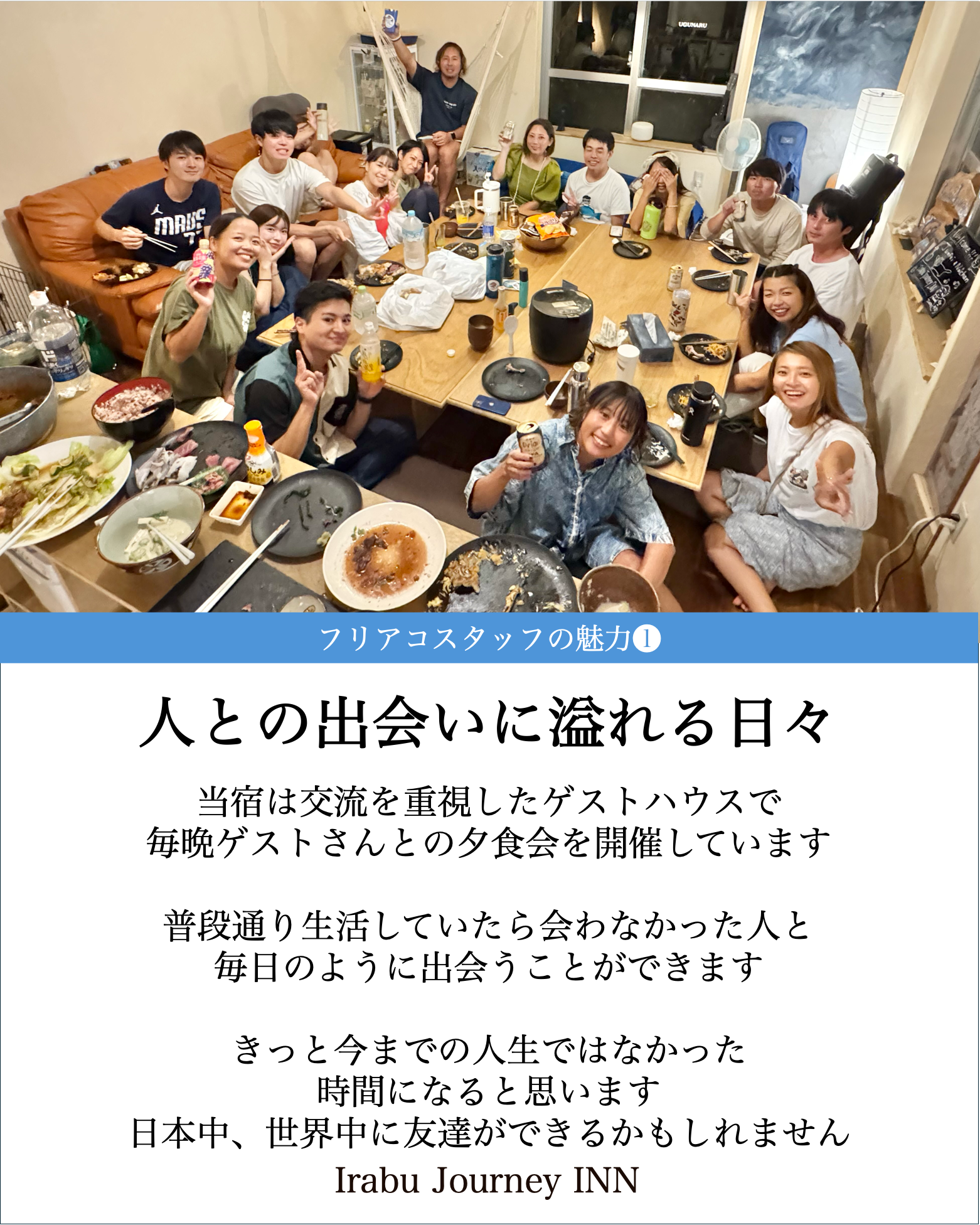 Irabu Journey INNではフリアコスタッフを募集しています。フリアコスタッフとはゲストハウスでの滞在費等を無料にする代わりにゲストハウス業務の一部をお手伝い頂くスタッフのことです。(お給料は出ません)伊良部島の美しい自然の中でゆったりとした時間を楽しみつつ、沢山の人と出会って、楽しい日々を過ごして頂けたらと思います。
