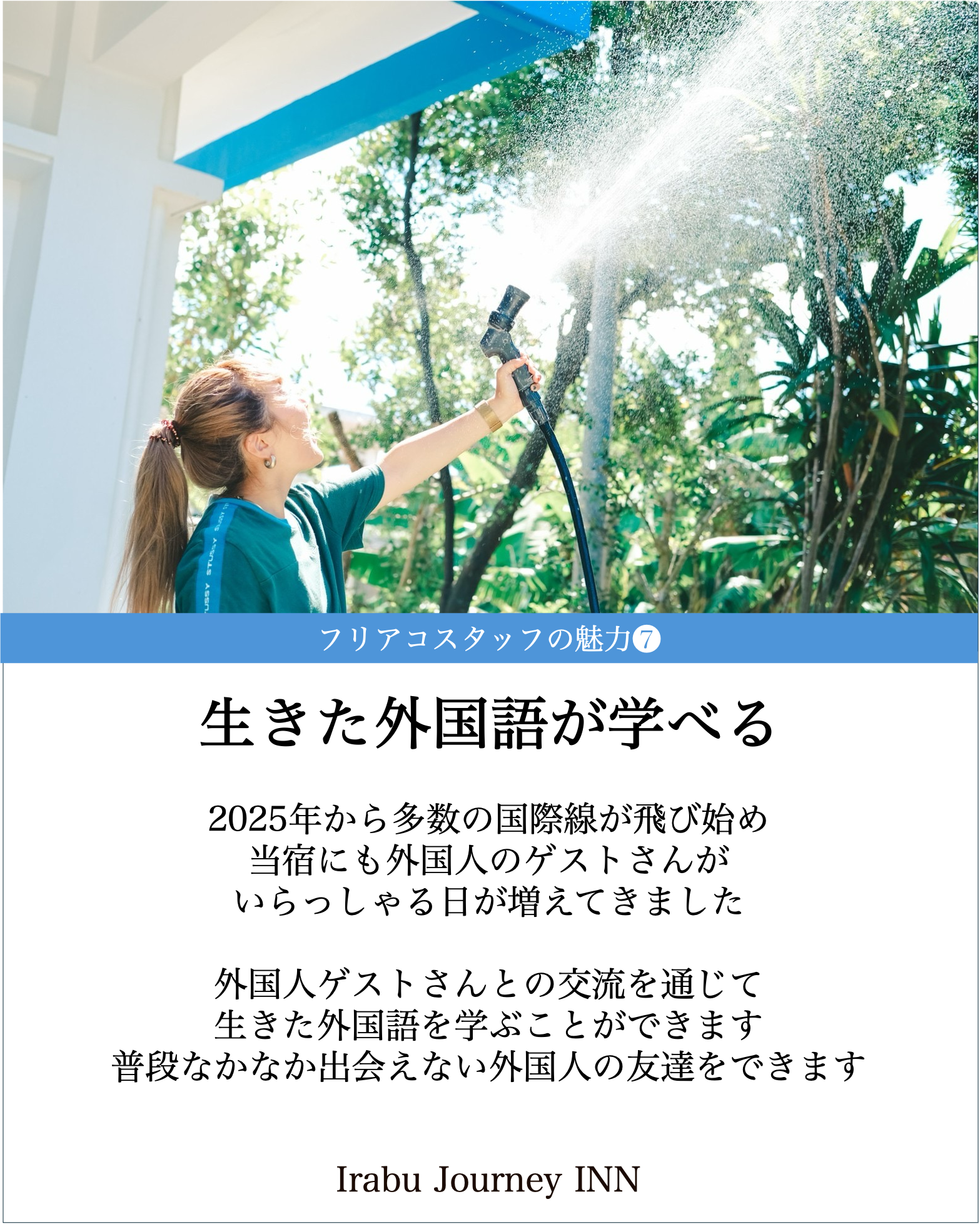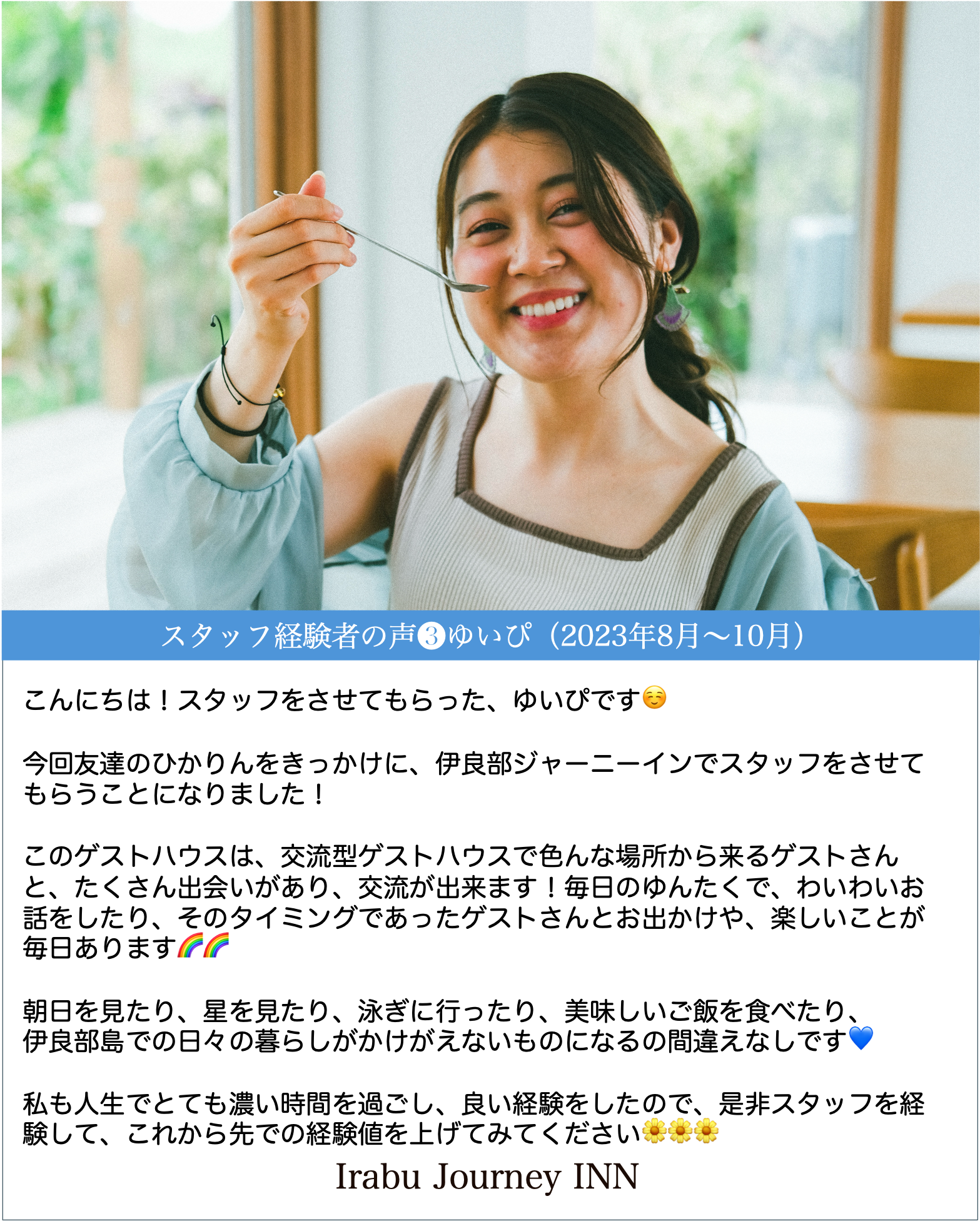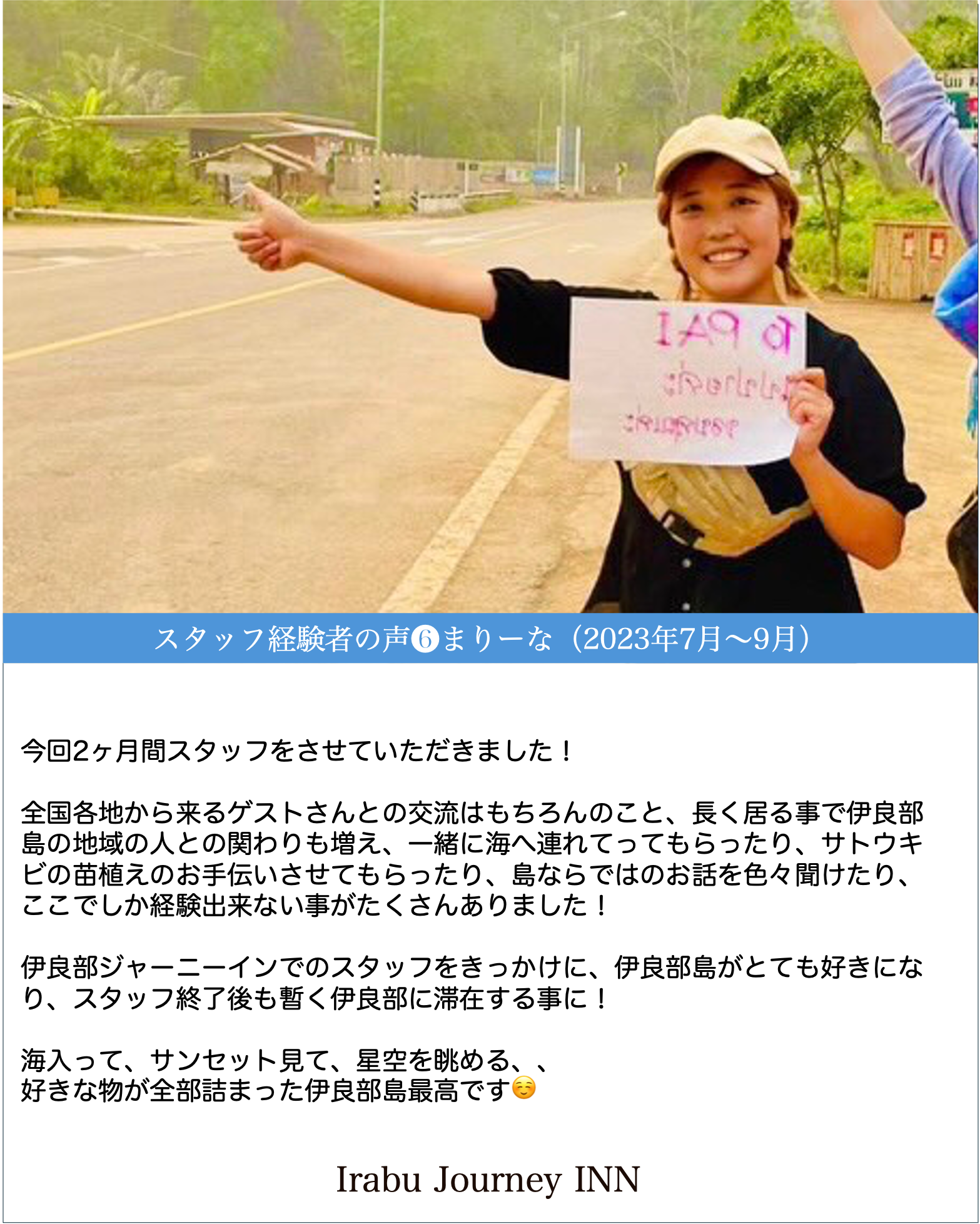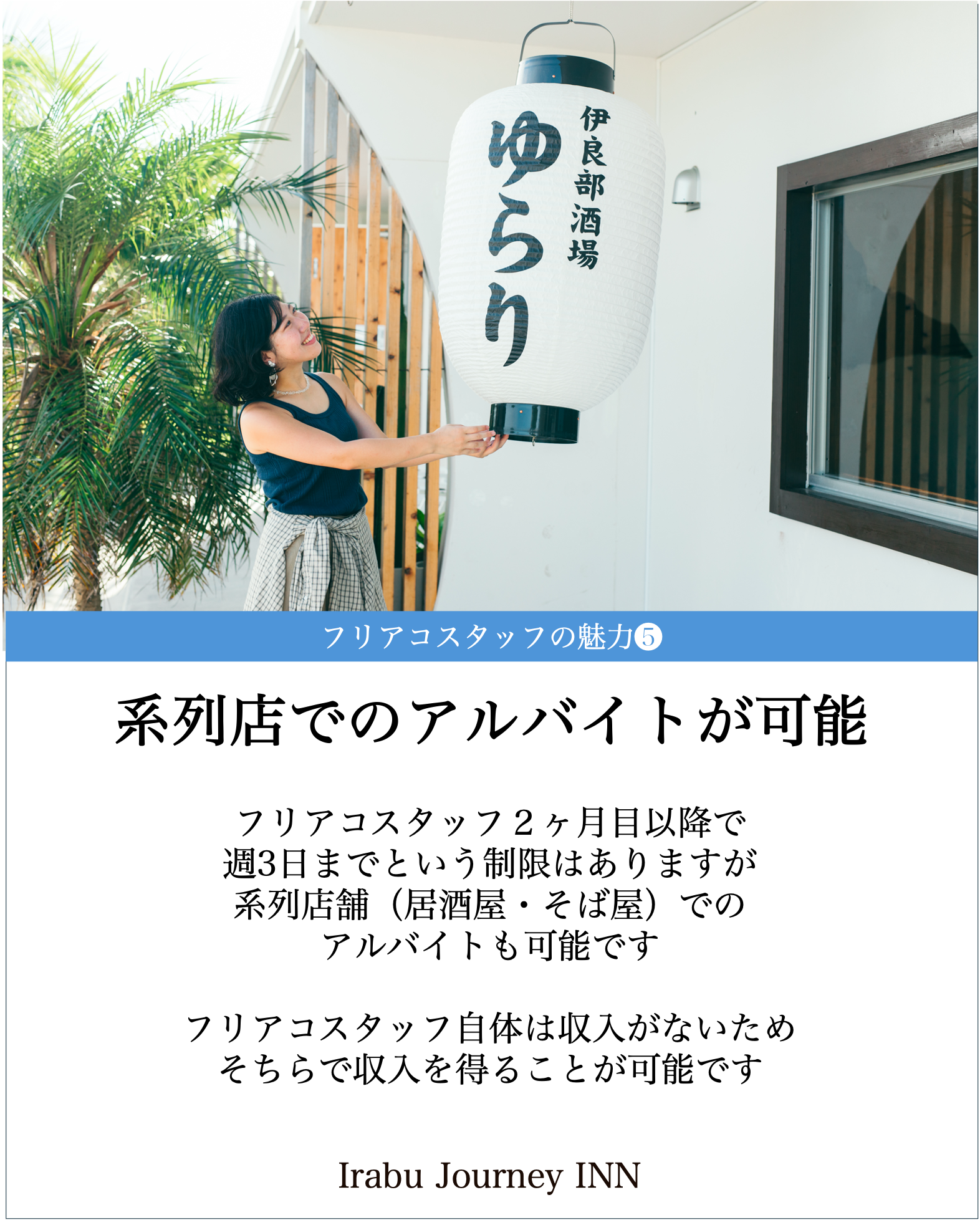 Irabu Journey INNではフリアコスタッフを募集しています。フリアコスタッフとはゲストハウスでの滞在費等を無料にする代わりにゲストハウス業務の一部をお手伝い頂くスタッフのことです。(お給料は出ません)伊良部島の美しい自然の中でゆったりとした時間を楽しみつつ、沢山の人と出会って、楽しい日々を過ごして頂けたらと思います。